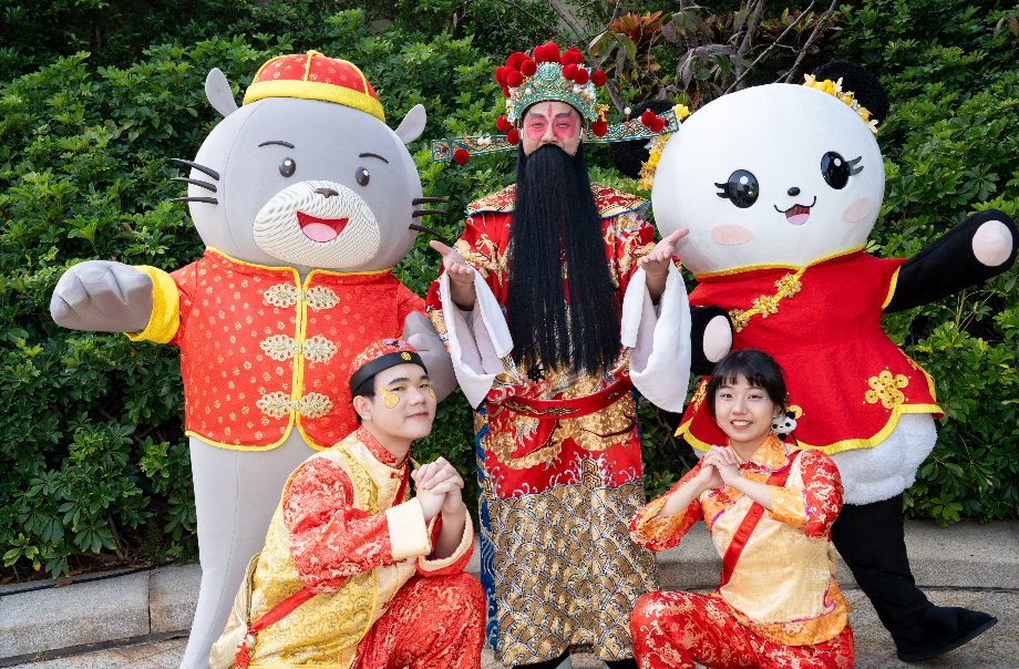 Ocean Park's dazzling float for the Cathay International Chinese New Year Night Parade makes an appearance, turning into a stunning photo spot! This year's float features the Park's iconic Ocean Express, cable cars and Ferris wheel, joined by the adorable Panda Friends in new year costumes! They make their grand debut on board, sending panda-full good luck blessings to all! Strike your best poses with family and friends to capture heartwarming memories together. Whiskers and Friends in festive outfits will also show up to greet you here. Don't miss your chance for festive selfies and group pics with them!